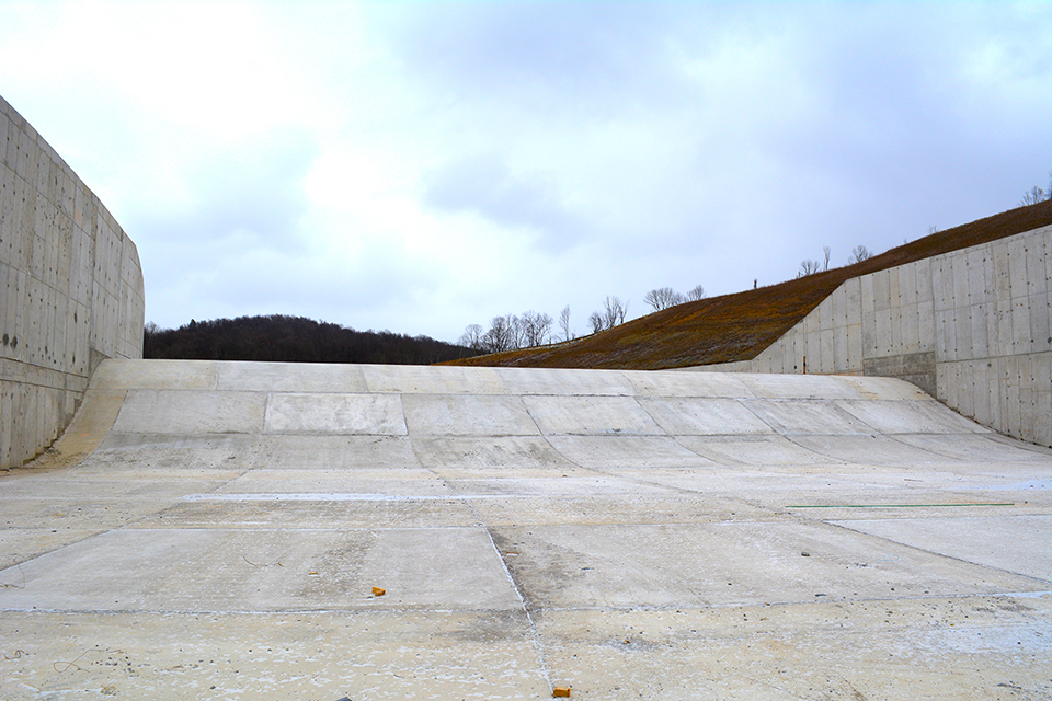 Below is a photo of the dam area, with the intake tower on the right. The second photo is of the spillway, with the third photo showing cement work being done inside the spillway. The final photo is of the ogee weir inside the spillway.