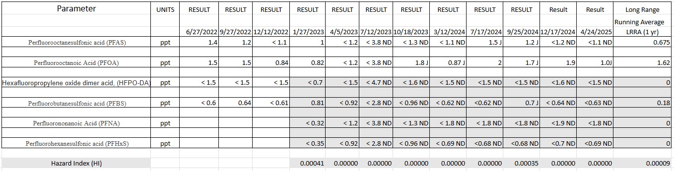 The Environmental Protection Agency (EPA) has published (March 14, 2023) its proposed rule on PFOAS chemicals in drinking water. Six PFOAS chemicals are proposed for regulation in the rule, these are shown in the table below along with our analysis results. PFAS and PFOA, have a proposed 4 ppt Maximum Contaminant Level (MCL) the remaining 4 compounds (HFPO-DA, PFBS, PFNA, PFHxS ) are grouped together with their analyzed concentrations weighted by their health based water concentrations and summed. The summation of theses values is designated the Hazard Index value (HI). The Maximum Contaminant Level Goal (MCLG) for this value is < 1.